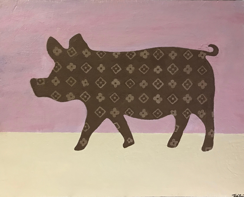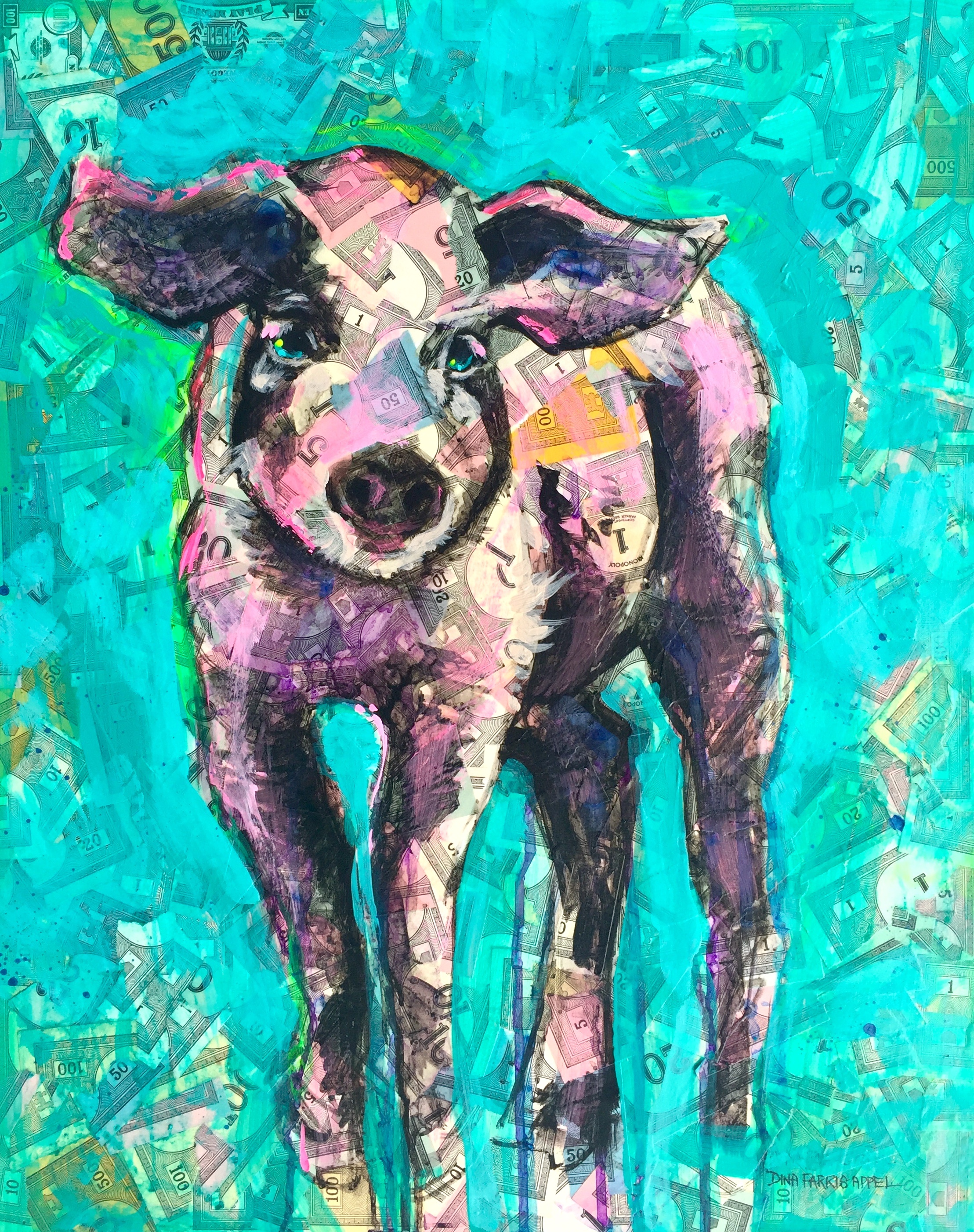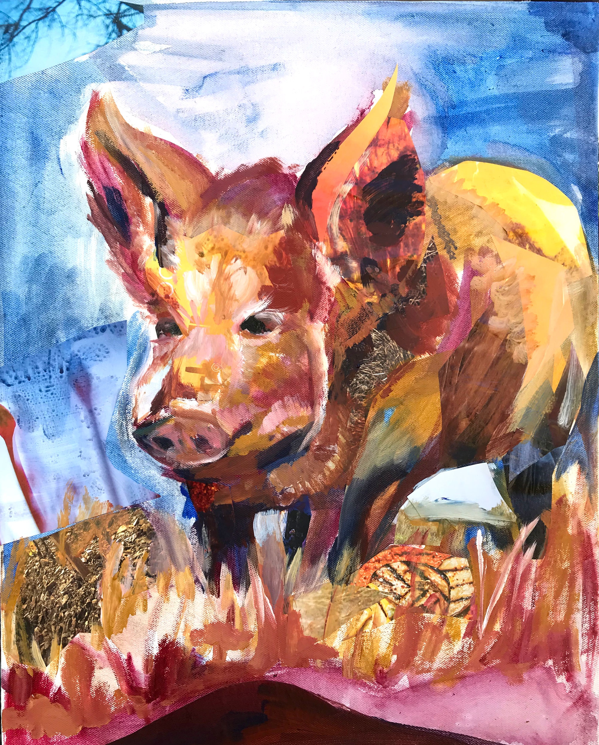 Eileen Hsu, Taking on the Year of the Pig, 2019, Paint, canvas, paper collage, 21.5 x 17 inches