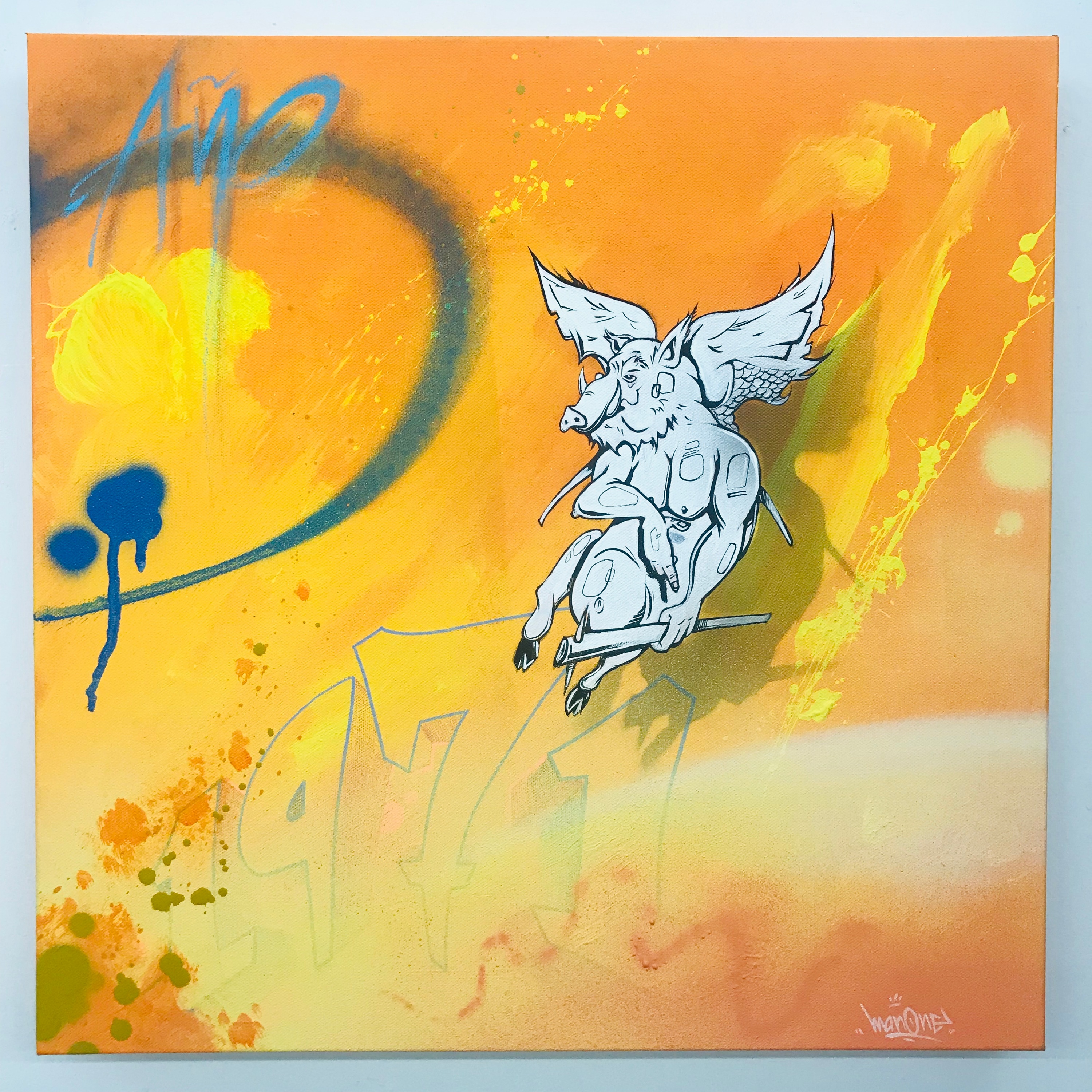 Man One, When Pigs Flew, 2019, Aerosol & acrylic on canvas, 20 x 20 inches