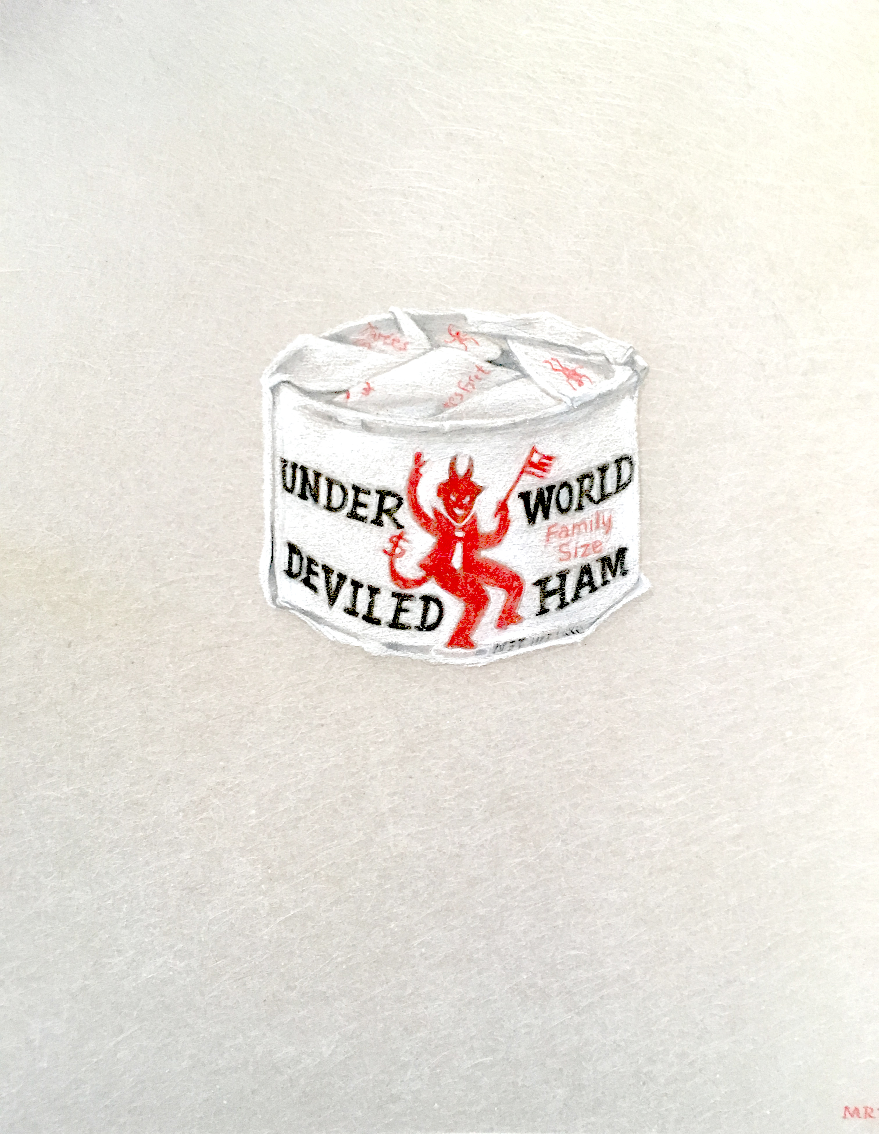Maryrose Cobarrubias Mendoza, Deviled Ham, 2019, Shrinky links plastic, colored pencil, 4 x 3.5 inches